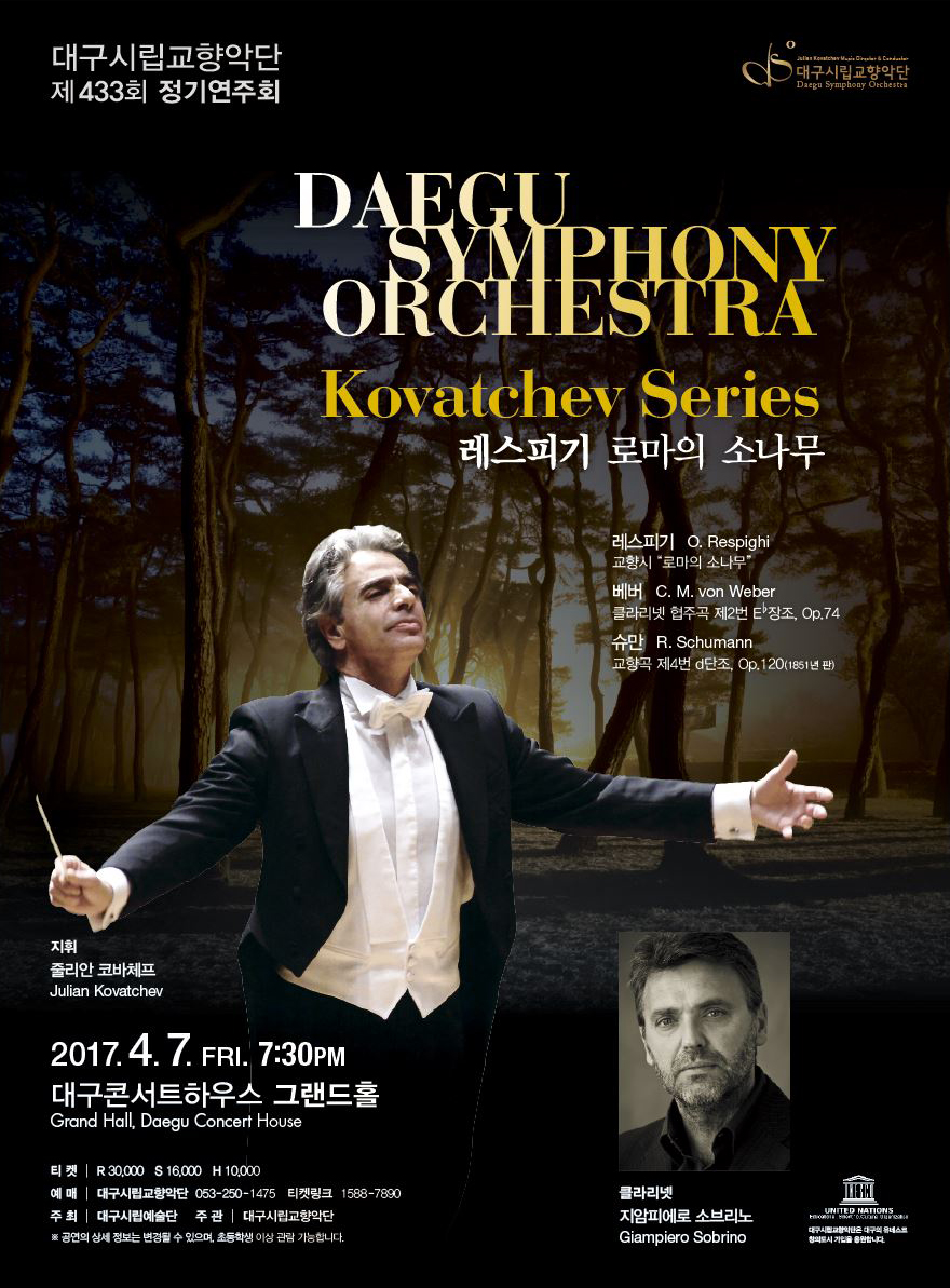대구시립교향악단 제433회, 제434회 정기연주회가 2017년 4월7일, 4월28일 저녁 7시30분 대구콘서트하우스에서 각각 열린다. 433회 정기연주회는 클래식선율로 재현한 로마의 역사와 정취라는 소제로 레스피기 "로마의 소나무"라는 주제로 열린다. 대구시향 상임지휘자 줄리안 코바체프 지휘하고 클라리네티스트 지암피에로 소브리노 협연으로 베버 "클라리넷 협주곡 제2번"을 감상하고, 레스피기의 "로마의 소나무", 슈만의 "교향곡 제4번"을 연주한다.